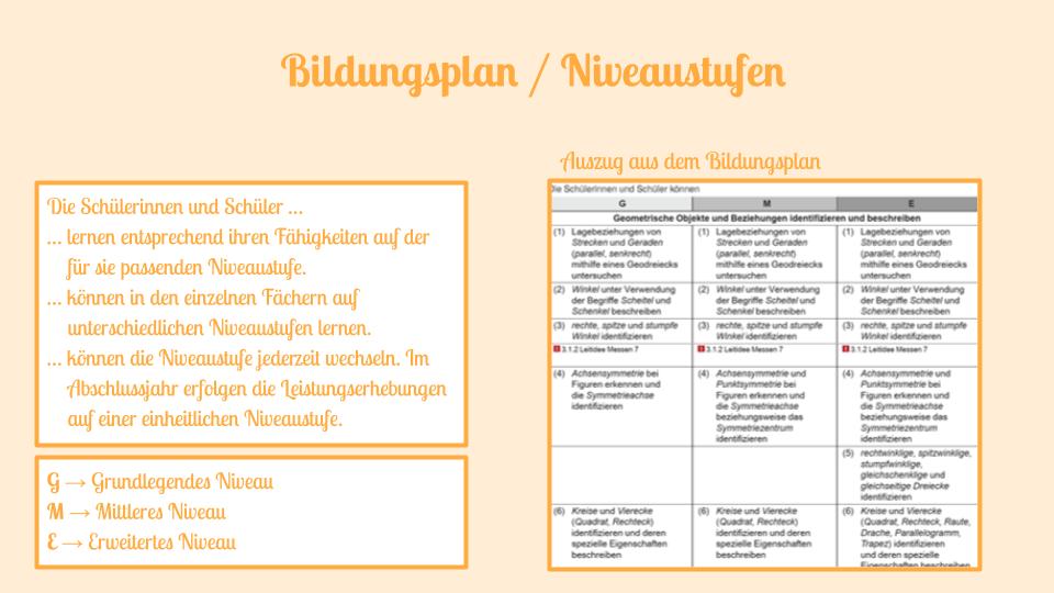 Für unsere Schule ist der Bildungsplan der Sekundarstufe I maßgebend, der drei verschiedene Niveaustufen ausweist und auf die verschiedenen Schulabschlüsse und Übergänge hinführt.