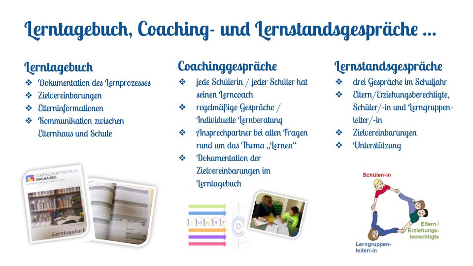 Diese Gespräche finden 3 Mal im Schuljahr statt. Anwesend sind die Kinder, mindestens ein Elternteil und der/die LerngruppenleiterIn.