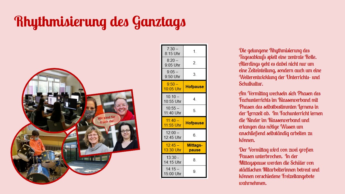 Konzentriertes Lernen im Klassenverband, individuell oder kooperativ, Entspannung und Rückzug, sowie soziales Miteinander und das Ausleben individueller Interessen, gebundene Freizeit und selbstbestimmte „Freie Zeit“ müssen an einer Ganztagesschule ...